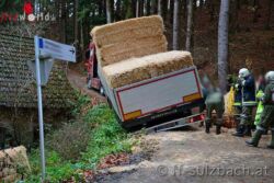 Oö: Mit Stroh beladener Sattelanhänger in einer Kurve abgerutscht