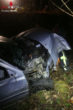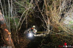 Das schwer beschädigte Auto blieb auf rund halber Strecke im Hang an den Bäumen hängen; der nach erster Einschätzung nur leicht verletzte Mann konnte sich selbst nicht mehr befreien und setzte gegen 4.20 Uhr bei der Leitstelle in Traunstein einen Notruf ab, die daraufhin die Freiwilligen Feuerwehren Schneizlreuth, Weißbach, Bad Reichenhall und Ramsau und das Rote Kreuz mit einem Rettungswagen, dem Reichenhaller Notarzt und den Bergwachten Bad Reichenhall und Freilassing losschickte.
