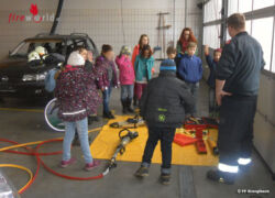Bei der ersten Station wurde mit dem gedanklichen Durchspielen eines Notrufes, echter Pageralarmierung im Feuerwehrhaus, dem Besetzen der Nachrichtenzentrale und dem „Probieren“ der Einsatzkleidung der – bei manchen Kindern immer noch keimende – Verdacht, Feuerwehrleute würden im Feuerwehrhaus schlafen und arbeiten, ebenso beseitigt wie die Annahme, dass alle Feuerwehrleute über die Rutschstange in die Fahrzeughalle kommen. Fahrzeuge, Geräte und Ausrüstung konnten die Kinder bei der zweiten Station nicht nur ansehen, sondern auch an – und somit auch begreifen wozu die Geräte im Feuerwehrdienst gebraucht werden.