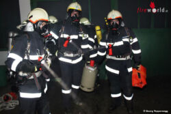 Im Anschluss wurde die Halle mit Hochdruckbelüftern rauchfrei gemacht. Bei den Atemschutzgeräten wurde wieder eine Einsatzbereitschaft hergestellt.