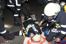 Nacheinander machten sich die anwesenden Atemschutztrupps bereit, und suchten in der stark verqualmten Werkstätte nach den drei Atemschutzträgern der FF Preding sowie nach den restlichen Personen. Mit der Unterstützung der Wärmebildkamera wurden die vermissten Kameraden gefunden und mittels einer Crash-Rettung aus dem Gebäude gerettet. Fast zeitgleich wurden die die beiden vermissten Arbeiter und die Gasflaschen aus dem Gebäude gebracht.