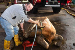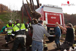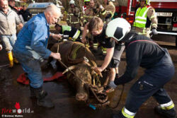 Erst dann konnten zwei Atemschutzträger hinabsteigen und das Tier an speziellen Gurten befestigen. Dann ging alles recht schnell. Die Milchkuh wurde mit dem Kran herausgehoben und vom anwesenden Tierarzt erstversorgt. Erschöpft, aber gesund, wurde sie von der Feuerwehr noch gereinigt.