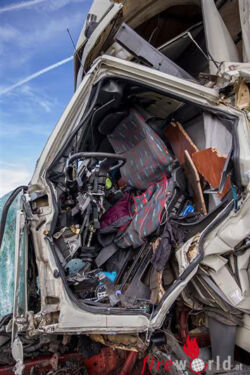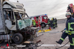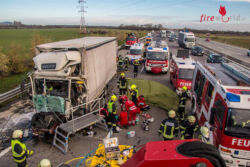 BAD VÖSLAU (NÖ): In den Vormittagsstunden des 16. November 2015 kam es auf der A2, der Südautobahn, in Fahrtrichtung Süden kurz vor der Ausfahrt Bad Vöslau zu einem folgenschweren Auffahrunfall. Aus bislang unbekannter Ursache prallte ein Kraftfahrzeuglenker mit seinem Planen-Lkw frontal in einen vor ihm fahrenden Lkw-Sattelkraftfahrzeugzug. Der Aufprall war dabei so heftig, dass die Führerhauskabine über einen Meter zusammengedrückt und der Lkw Lenker dabei schwer verletzt eingeklemmt wurde.