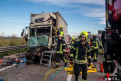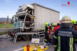 Über die Feuerwehr Bezirksalarmzentrale Baden wurde die laut Autobahnalarmplan zuständige Freiwillige Feuerwehr Baden-Leesdorf sowie die FF Tribuswinkel zu einer Menschenrettung mit eingeklemmter Person nach Verkehrsunfall alarmiert. Nachdem die ersten Feuerwehreinsatzkräfte an der Unfallstelle eintrafen wurde nach Lageerkundung und Rücksprache mit dem ebenfalls alarmierten Notarztteam aus Baden sofort eine Arbeitsplattform im Bereich der total deformierten Führerhauskabine in Stellung gebracht. So konnte den Rettungskräften eine bessere Arbeitsposition für die Erstversorgung zum nur schwer zugänglichen verletzten Lenker in einer Höhe von ca. 2,5-3m Metern ermöglicht werden. Denn der Lenker wurde nach dem Aufprall regelrecht mit seinem Sitz im zusammengeschobenen Führerhaus in die Höhe gedrückt und mit dem Oberkörper zwischen der Lenkradsäule und der Fahrzeugfront eingeklemmt.