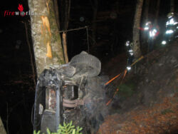 Daraufhin wurde die Schleifkorbtrage mit Vakuummatratze durch den Fahrzeugkran des SRF-K zur Unfallstelle hinunter gelassen. Die verletzte Person wurde darin durch einen ebenfalls am Kranhaken gesicherten Feuerwehrmann nach oben gehoben und dem Notarzt übergeben. Nachdem der Verletzte abtransportiert war, wurde das Unfallfahrzeug noch mit dem Kran der FF-Ferlach in eine Ausweiche gehoben. Unterstützt wurde die Rettungsaktion durch die ebenfalls alarmierte Bergrettung Ferlach.