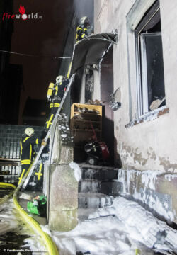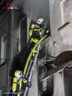 Ausgerüstet mit Pressluftatmern und Strahlrohren gingen zwei Trupps in das brennende Gebäude vor und konnten die Flammen im Erdgeschoss zügig eindämmen. Beim Weg über die Holztreppe in das erste Obergeschoss meldete der vorgehende Trupp: "Akute Einsturzgefahr der Holzdecken"! Diese waren durch die enorme Hitze teilweise schon durchgebrannt. Ein weiteres Vorgehen war somit aus Sicherheitsgründen unmöglich. Um die Flammen auch im ersten Obergeschoss zu löschen, mussten auf der Vorder- und Rückseite des Gebäudes Leitern aufgestellt werden. Auch aus Fenstern eines Nachbargebäudes erfolgten die weiteren Löschmaßnahmen. Das Aufstellen einer Drehleiter war aufgrund der Hinterhoflage nicht möglich. Trotz dieser erschwerten Umstände konnte ein Übergreifen des Brandes auf das Nachbargebäude verhindert werden und der Brand war nach etwa 45 Minuten unter Kontrolle.