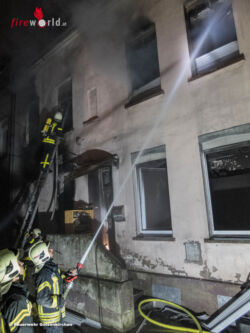 Den ersten Einsatzkräften bot sich ein dramatisches Bild. Ein zweigeschossiges Wohnhaus im Hinterhof der Straße "Wiehagen" brannte in voller Ausdehnung. Sowohl aus den Fenstern im Erdgeschoss, als auch aus den Räumen im ersten Obergeschoss schlugen bereits meterhohe Flammen. Glücklicherweise konnte durch die Befragung der Personen vor dem Brandhaus schnell herausgefunden werden, dass sich niemand mehr in dem brennenden Haus befand. Dort lebte eine zehnköpfige Familie, die sich bei Bekannten aufhielt. Lediglich eine Nachbarin, die Zeugin des Brandes war, erlitt einen Kreislaufkollaps und musste vom Notarzt versorgt und zur weiteren Behandlung in ein Krankenhaus gebracht werden. Die Einsatzkräfte konnten sich somit schnell auf die Brandbekämpfung konzentrieren, zumal die Flammen bereits auf das angrenzende Wohnhaus überzugreifen drohten.