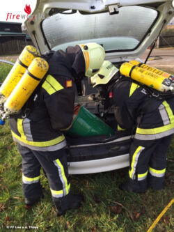 Unter dem PKW war eine Person eingeklemmt. Bei der Annäherung zum betreffenden Fahrzeug konnte der Gruppenkommandant Fässer im Fahrzeuginneren wahrnehmen. Kennzeichnungen oder Gefahrennummer konnten keine Wahrgenommen werden. Auch der Lenker konnte keinerlei Angaben zum Inhalt der Fässer machen. Aus diesem Grund wurde die Umgebung des Fahrzeuges großräumig abgesperrt, ein Brandschutz wurde aufgebaut und ein Atemschutztrupp rüstete sich aus, um zum Fahrzeug zu gelangen, um einerseits die Menschenrettung durchzuführen und andererseits herauszufinden, welche Substanz sich in den Fässern befindet. Der Atemschutztrupp begab sich zu der Person und begann mit Ersten-Hilfe-Maßnahmen. Außerdem wurde bzgl. der Substanz in den Fässern Nachschau gehalten. Es konnte hierbei festgestellt werden, dass es sich um keinen gefährlichen Stoff handelt. Aus diesem Grund konnten sich die übrigen Feuerwehrmitglieder ohne weiteren Körperschutz annähern und eine Menschenrettung wurde durchgeführt. Hierbei wurde das Fahrzeug mittels Hebekissen angehoben, bis ein Hervorziehen der Person möglich war.