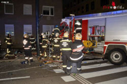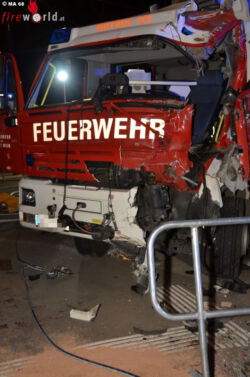 Wien: Feuerwehrmann nach Kollision mit Pkw und Laternenmast im Einsatzfahrzeug eingeklemmt