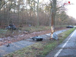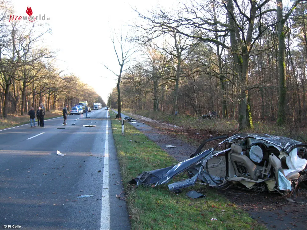 Gegen 13.20 Uhr, befuhr der Audi die Strecke in Richtung Hambühren in einer Fahrzeugschlange. Der Verkehr staute sich hinter einem Fahrzeug der Straßenmeisterei, da dessen Insassen eine Streckenkontrolle durchführten. Der Fahrer scherte zum Überholen aus und beschleunigte das Fahrzeug. Im Zuge dessen kam das Auto nach links von der Straße ab und schleuderte mit der rechten Fahrzeugseite gegen einen Baum. Das Auto wurde dabei in zwei Teile gerissen.