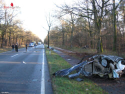 CELLE (DEUTSCHLAND): Zu einem schweren Verkehrsunfall kam es am frühen Nachmittag des 23. November 2015 auf der Bundesstraße 214 zwischen Celle und Hambühren. Bei dem Unfall wurde der Audi A6 in zwei Teile gerissen und der Fahrer verletzt.
