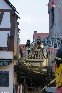 Gegen 05.20 Uhr informierten Anwohner die Rettungsleitstelle über den Brand in dem Unterstand, der bereits bei Eintreffen der Feuerwehr auf das benachbarte Fachwerkhaus übergegriffen hatte. Im Erdgeschoss des Hauses befand sich ein Bistro, im Obergeschoss eine Wohnung. Die Feuerwehr rettete bei ihrem Eintreffen die einzige Bewohnerin des Hauses, welche leicht verletzt mit einer Rauchgasvergiftung in ein Krankenhaus gebracht wurde.