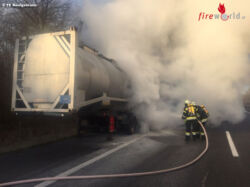 Der mit Glykol beladene Tankaufleger war infolge eines Reifenschadens in Brand geraten. Unter Einsatz mit schweren Atemschutzes gelang es den Brand, welcher bereits auf die Außenseite des Tankauflegers übergegriffen hatte, zu löschen. Durch den raschen Einsatz der Feuerwehr könnte ein größeres Schadensereignis verhindert werden.