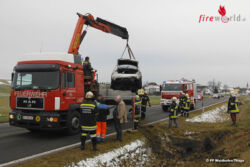 Beim sofort eingeleiteten Ausweichmanöver kam der Wagen von der Straße ab, schlitterte dem Graben entlang, krachte gegen eine betonierte Feldzufahrt und wurde zurück auf die Fahrbahn katapultiert. Der verletzte Fahrer wurde vom Roten Kreuz erstversorgt und ins Krankenhaus zur weiteren Behandlung abtransportiert. Bei der Ankunft der Einsatzkräfte der Freiw. Feuerwehr Waidhofen/Thaya hatte die Feuerwehr Nonndorf die Unfallstelle bereits abgesichert und die Polizei die Unfallaufnahme abgeschlossen.