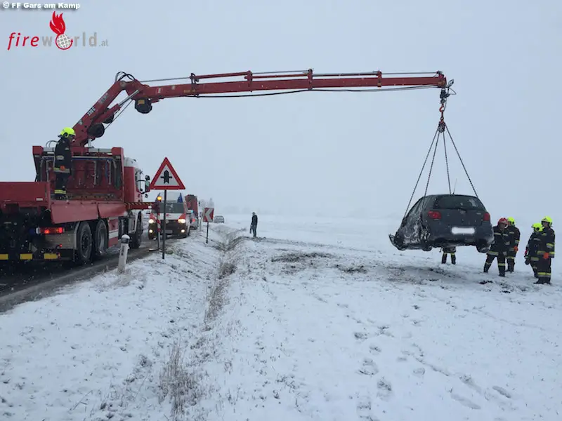 Eine Autolenkerin geriet auf der schneematschbedeckten Fahrbahn ins Schleudern, krachte in den Straßengraben und kam im angrenzenden Feld am Dach zum Liegen. Bei Eintreffen der Feuerwehr wurde die Lenkerin bereits durch das Rote Kreuz betreut und mit Verletzungen unbestimmten Grades in das Landesklinikum Waldviertel Horn eingeliefert. Anschließend wurde das Auto auf die Räder gestellt, mittels Kran des Wechselladefahrzeuges geborgen und von der Einsatzstelle verbracht. Während der Bergungsarbeiten wurde der Verkehr durch die Polizei Gars wechselweise angehalten.