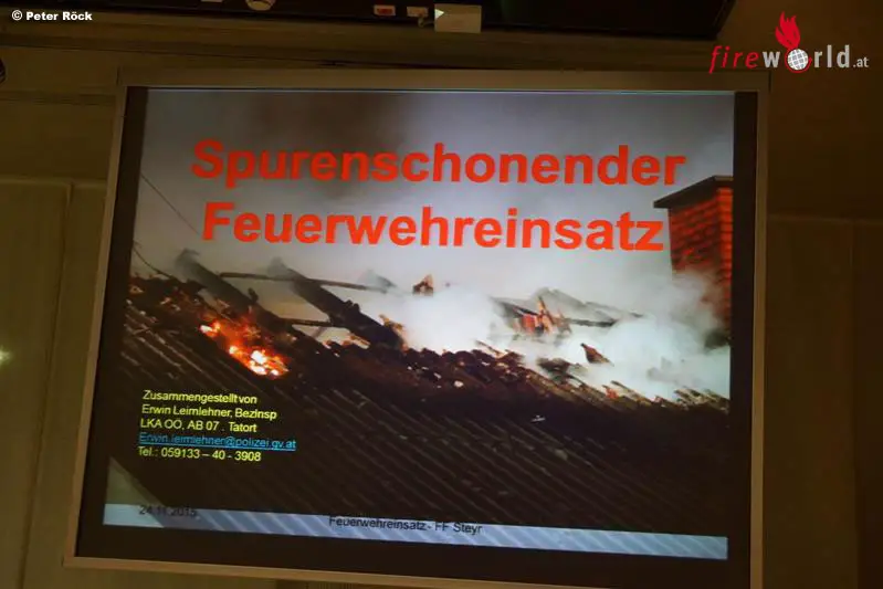 An diesem Abend wurden 200 Personen von Feuerwehren und Polizeiinspektionen der Bezirke Steyr-Stadt und Steyr-Land über die Zusammenarbeit von Feuerwehr und Polizei bezüglich spurenschonender Feuerwehreinsätze geschult, da es bei Bränden immer wieder vorkommt, dass wichtige Spuren durch einen Feuerwehreinsatz vernichtet werden.