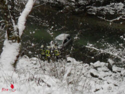Am Unfallort angekommen, die Polizei war bereits vor Ort, stellte sich die Situation nicht mehr ganz so tragisch, wie es der Einsatzbefehl befürchten ließ, dar. Der unverletzte Unfalllenker, der alleine im Fahrzeug war, konnte sich selbst aus der misslichen Lage befreien und war bereits über die Böschung auf die Straße geklettert. Für die Dauer der Fahrzeugbergung, die durch die winterlichen Verhältnisse (Wassertemperatur ca. 4°C) und der Steilheit des Geländes erschwert wurde, musste die L6172 in beiden Richtungen gesperrt werden. Mithilfe der Seilwinde vom TLFA wurde das Fahrzeug wieder auf die Straße gezogen, und auf einem nahegelegenen Parkplatz gesichert abgestellt. Um 11.30 Uhr war der Einsatz beendet und die Einsatzbereitschaft wieder hergestellt.