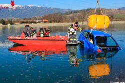 KNITTELFELD (STMK): „Fahrzeug im Badeteich – Person vermisst“. Diese Einsatzmeldung erreichte 17 Feuerwehrmänner aus Apfelberg und Knittelfeld am frostigen Samstag Morgen. Am 28. November 2015 fand in der Freizeitanlange Zechner in Kobenz eine groß angelegte Übung des Feuerwehrwasserdienstes statt.