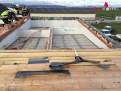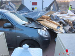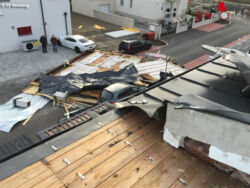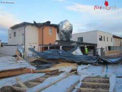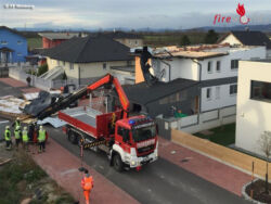 Arbeitsintensiv war der Strumschaden an einem Einfamilienhaus am Tannhäuserring, wo ein komplettes Dach mit Dachunterkonstruktion komplett abgedeckt wurde. Lose Blechteile, Baumaterialen und Trümmer mussten gesichert wurden. Hierbei wurde sogar der Straßenzug gesperrt. Unterstützt wurden die Ensattzkräfte aus Himberg mit dem Wechselladerfahrzeug der Feuerwehr Schwechat mit einem leistungsstarken Ladekran und Spezialgreifer.