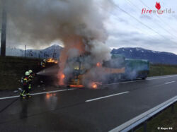 AU (SCHWEIZ): Am Dienstag, 01.12.2015, um 07:50 Uhr, ist ein Lastwagen auf der Autobahn A13, Fahrtrichtung Widnau – Au, in Brand geraten. Es entstand Sachschaden von mehr als 100‘000 Franken.