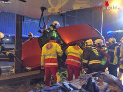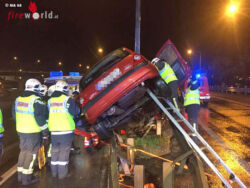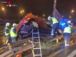 Durch die auseinanderlaufenden Leitschienen war der Pkw schlussendlich zwischen diesen um 45 Grad gekippt und zum Stillstand gekommen. Nachdem das Fahrzeug von der Feuerwehr gegen weiteres „Kippen“ gesichert wurde, konnte die Lenkerin über die hintere Beifahrertüre befreit werden. Anschließend wurde der Pkw mittels Ladekran vom Feuerwehrabschleppfahrzeug verhoben und von der Autobahn gebracht. Die BF Wien stand mit 30 Mann und sechs Fahrzeugen bis 20.48 Uhr im Einsatz.