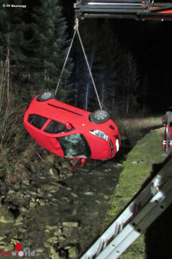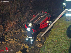 Die Feuerwehr baute eine Beleuchtung auf, und stellten sicher, dass keine Flüssigkeiten austreten konnten. Anschließend wurde durch eine Abschleppfirma das Fahrzeug aus dem Bachbett geborgen.
