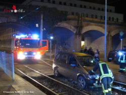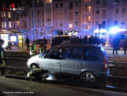 MÜHLHEIM AN DER RUHR (DEUTSCHLAND): Am frühen Abend des 4. Dezember 2015 bog ein Pkw in Mühlheim an der Ruhr im Bereich der Friedrich-Ebert-Straße falsch ab und landete im Gleisbett. Nach mehreren Versuchen eigenständig aus dem Gleisbett zu rangieren, hatte sich der Pkw festgefahren.