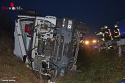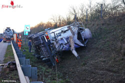 WIENER NEUDORF (NÖ): Am Freitag, dem 4. Dezember 2015, um 15.44 Uhr wurde die Freiwillige Feuerwehr Wiener Neudorf zu einer Menschenrettung mit einer eingeklemmten Person alarmiert. Der Unfall ereignete sich kurz vor der Ausfahrt Traiskirchen auf der A2 Fahrtrichtung Graz. Aus ungeklärter Ursache kam ein Betonmischer mit 17 Tonnen Gesamtgewicht von der Fahrbahn ab und kippte auf die Autobahnböschung.