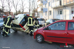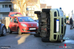 AUGSBURG (BAYERN): Kurz vor 15:00 Uhr wurde die Berufsfeuerwehr Augsburg am 6. Dezember 2015 in die Fraunhoferstraße gerufen. Nach einem Verkehrsunfall lag ein Kleinwagen auf der Seite.