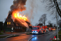 STADE (DEUTSCHLAND): Gegen 08:40 Uhr wurde am 7. Dezember 2015 Qualm an einem Reetdachhaus in der Harburger Straße in Stade bemerkt. Sofort wurden Feuerwehr und Polizei alarmiert. Als die ersten Einsatzkräfte kurze Zeit später am Brandort eintrafen, stand der Dachstuhl des ca. 25 x 15 Meter großen, vor 1880 gebauten, ehemaligen landwirtschaftlichen Gebäude bereits lichterloh in Flammen.