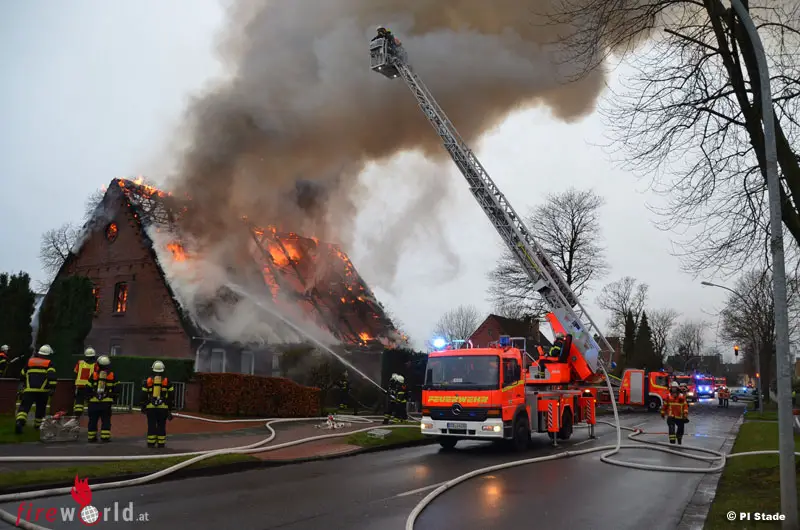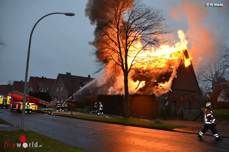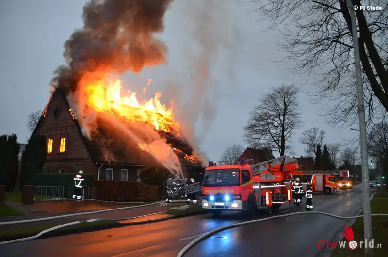 STADE (DEUTSCHLAND): Gegen 08:40 Uhr wurde am 7. Dezember 2015 Qualm an einem Reetdachhaus in der Harburger Straße in Stade bemerkt. Sofort wurden Feuerwehr und Polizei alarmiert. Als die ersten Einsatzkräfte kurze Zeit später am Brandort eintrafen, stand der Dachstuhl des ca. 25 x 15 Meter großen, vor 1880 gebauten, ehemaligen landwirtschaftlichen Gebäude bereits lichterloh in Flammen.