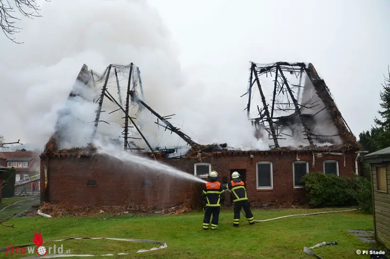 Ca. 100 Feuerwehrleute aus beiden Zügen der Ortswehr Stade, der Ortswehr Wiepenkathen sowie der Ortswehr Bützfleth mit der Löschgruppe Bützflether Moor rückten an der Einsatzstelle an. Trotz massiven Löscheinsatzes auch über zwei Drehleitern und unter schwerem Atemschutz, konnte das Gebäude nicht gehalten werden und brannte bis auf die Grundmauern nieder. Mit einem Bagger mussten Teile des Gebäudes eingerissen werden, um alle Glutnester vom Reetdach und dem auf dem Boden gelagerten Stroh endgültig mit Löschschaum ablöschen zu können. Die Löscharbeiten dauerten bis gegen 12:00 h an.