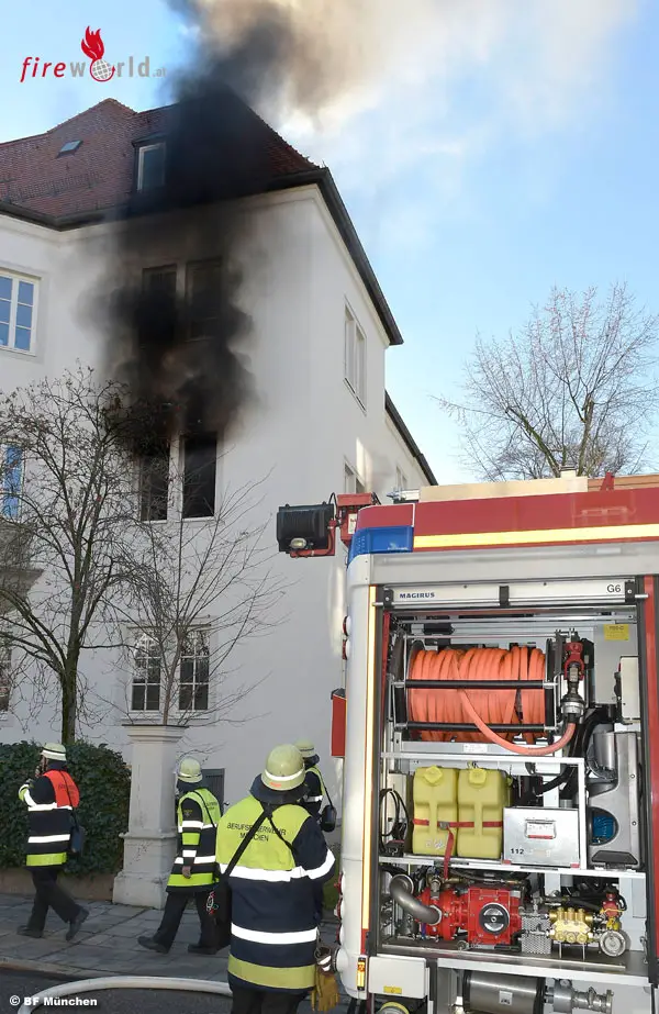 MÜNCHEN (BAYERN): Der Brand einer kleinen Tischrechner führte zu Mittag des 10. Dezember 2015 in München zu einem Schaden von mindestens 50.000€. Bei Ankunft der Einsatzkräfte war das Bürogebäude bereits evakuiert und alle Mitarbeiter hatten sich in Sicherheit gebracht. Aus einem Fenster im ersten Obergeschoss drang dichter schwarzer Rauch.