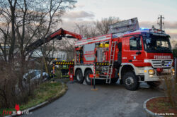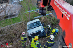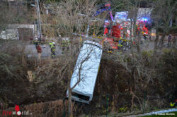 Der am Straßenrand abgestellte Klein-Lkw stürzte über die Böschung hinab und wurde nur mehr von einem Baum am Umstürzen gehindert. Über den Feuerwehrnotruf 122 – verständigte der Mann die Einsatzkräfte. Die durch die Bezirksalarmzentrale alarmierte Freiwillige Feuerwehr Brunn am Gebirge traf kurz vor 14 Uhr am Unfallort ein. Nach erster Erkundung, Sicherungsmaßnahmen und Befragung des unverletzten Lenkers wurde zur Bergung des abgestürzten Fahrzeuges um die Unterstützung durch einen leistungsstarken Ladekran ersucht. Aus diesem Grunde wurde als zweite Feuerwehr die Freiwillige Feuerwehr Wiener Neudorf mit dem schweren Rüstfahrzeug sowie einem Begleitfahrzeug an die Unfallstelle alarmiert.