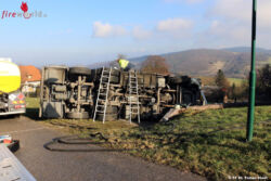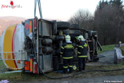 NEUSTIFT-INNERMANZING (NÖ): Am Morgen des 10. Dezember 2015 ging in der Bereichsalarmzentrale St. Pölten ein Notruf bezüglich eines verunglückten Tankwagens ein. In Almerberg bei Neustift-Innermanzing war ein mit knapp 10.000 Liter Heizöl beladener Tanklaster aus unbekannter Ursache auf eine Mauer gefahren und umgekippt.