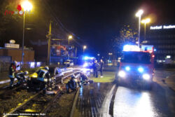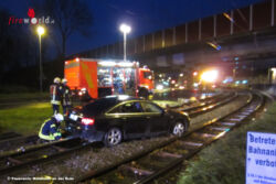 MÜHLHEIM AN DER RUHR (DEUTSCHLAND): Gegen 06:40 Uhr wurde die Leitstelle der Berufsfeuerwehr Mülheim an der Ruhr am 13. Dezember 2015 von der Polizei zu einem Verkehrsunfall zur Mellinghofer Straße in Höhe der Autobahnbrücke A40 gerufen. Aus bisher noch ungeklärter Ursache kam ein Personenkraftwagen von der Fahrbahn ab und landete cirka 40 Meter von der Fahrbahnkante entfernt im Gleisbett der Straßenbahn.
