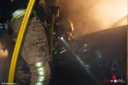 Danach begannen die Nachlöscharbeiten, unterstützt durch die Verwendung einer Wärmebildkamera. Daher wurden auch Glutnester schnell aufgefunden und abgelöscht. Die Motorhaube des Pkws musste mit einem hydraulischen Spreizer geöffnet werden, um die Löscharbeiten auch im Motorraum durchführen zu können.