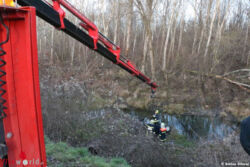 Als die Rettungskräfte eintrafen war der Lenker schon aus dem Wagen befreit. Ob er alleine oder von nachkommenden Ersthelfern befreit wurde, ist nicht bekannt. Der Unfalllenker wurde mit unbestimmten Verletzungen in das Spital gebracht. Die Feuerwehren mussten zunächst mit der Motorsäge einen Zugang zum Unfallort schaffen. Um das ausgetretene Öl aufzufangen wurde Ölbindemittel aufgebacht. Nach der Sicherung des Wagens konnte das Wrack mit dem Kran der Feuerwehr Tulln Stadt auf die Fahrbahn gehoben werden. Der FF Zwentendorf verbrachte das Unfallauto und stellte es sicher ab. Die FF Bärndorf reinigte die Unfallstelle von den Wrackteilen und entsorgte das ausgestreute Ölbindemittel fachgerecht. Während der Bergemaßnahmen war die L112 eine halb Stunde gesperrt. Vor Ort konnte keine Alkoholkontrolle durchgeführt werden. Die Exekutive veranlasste dass die Kontrolle im Krankenhaus nachgeholt werden soll.