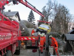 BAD GOISERN (OÖ): Nicht schlecht staunten am 13. Dezember 2015 jene Hausbesitzer in Unterjoch/Bad Goisern, als sie plötzlich ein in ihrem Garten liegendes Fahrzeug vorfanden. Zur Bergung musste die Feuerwehr mittels Kran anrücken.
