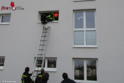 Eine Nachbarin alarmierte schließlich die Einsatzkräfte. Versuche der Feuerwehr, das Kind zum Öffnen der Wohnungstüre zu bewegen, schlugen leider fehl. Schließlich entschied man sich zum Öffnen eines Küchenfensters im 1. Stock durch einen Leiterneinsatz. Nach kurzer Zeit konnte das Kind wieder wohlbehalten der erleichterten Mutter übergeben werden.