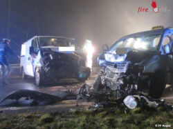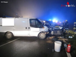 REGAU (OÖ): Zu einem schweren Verkehrsunfall mit eingeklemmter Person wurden die Freiwilligen Feuerwehren Regau und Rutzenmoos am Samstag, 19. Dezember 2015, kurz vor 6 Uhr früh von der Landeswarnzentrale alarmiert. Ein Taxi und ein Klein-Bus waren auf der B 145, kurz vor der Kreuzung zum Star-Movie, frontal zusammengestoßen.