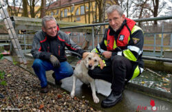 MÜNCHEN (BAYERN): Der Aufmerksamkeit eines Mitarbeiters des Wasserkraftwerks am Auer Mühlbach ist es zu verdanken, dass einem Golden Retriever Rüden zu Mittag des 21. Dezember 2015 nichts Schlimmeres passiert ist. Passanten bemerkten einige Zeit vor der Rettung den Hund im Auer Mühlbach im Bereich der Nockherstraße treiben.