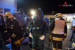 Nach Lageerkundung durch den Einsatzleiter, sowie einem Atemschutztrupp des TLF konnte eine enorme Rauchentwicklung im Objekt befindlichen Gefahrgutlager festgestellt werden. Nach weiterer Erkundung mit der Wärmebildkamera und gleichzeitiger Überdruckbelüftung des Objektes, wurde ein 1.000 Liter Plastikcontainer als Ursache ausgemacht, welcher aufgrund von Reaktionen bereits verformt war und dementsprechende Wärmeentwicklung (ca. 100 bis 110 Grad) aufwies.
