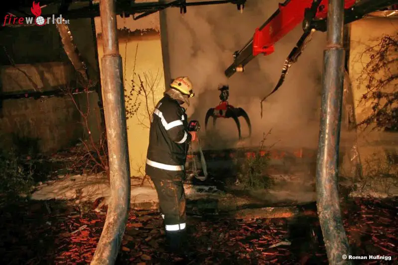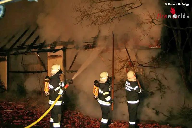 Folgerichtig ließ die zuständige Feuerwehr Stiwoll gleich weitere Feuerwehren (FF St. Pankrazen-Gschnaidt, FF Hitzendorf und FF Eisbach-Rein) nachalarmieren. Beim Eintreffen der ersten Feuerwehrkräfte stand das Wirtschaftsgebäude in Vollbrand. Durch das rasche Nachalarmieren verfügte man jedoch bereits in der ersten Phase über ausreichende Hilfskräfte und es konnte sofort mit der Brandbekämpfung, aber auch mit der notwendigen Löschwasserversorgung aus umliegenden Hydranten und mittels der angeforderten Tanklöschfahrzeuge, begonnen werden.