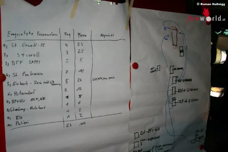 FF Stiwoll, FF St. Oswald b. Plankenwarth – St. Bartholomä, FF St. Pankrazen-Gschaidt, FF Eisbach-Rein, BtF Sappi, FF Hitzendorf, FF Steinberg-Rohrbach mit 23 Einsatzfahrzeugen und 114 Feuerwehrmitgliedern