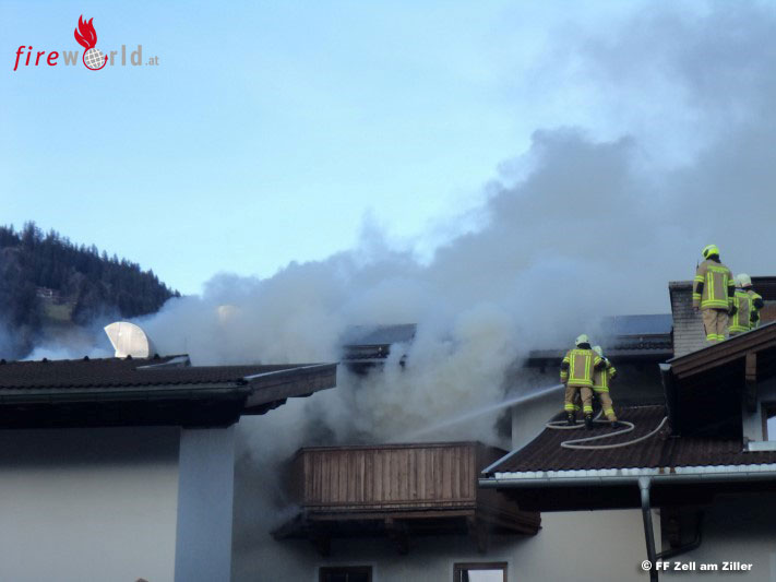Tirol: Sieben Feuerwehren mit drei Hubrettungsgerät bei Saunabrand in Hotel in Zell am Ziller im Einsatz