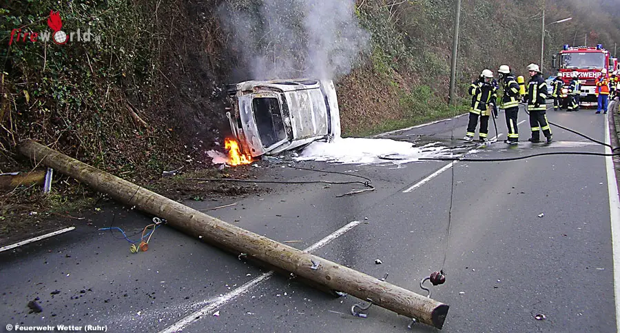 WETTER (RUHR) (DEUTSCHLAND): Am Montag, 28. Dezember 2015, wurde die Feuerwehr Wetter zusammen mit dem Rettungsdienst gegen 15:00 Uhr zu einem Verkehrsunfall auf die Hagener Straße gerufen. Ein PKW-Fahrer war aus Richtung Hagen kommend mit seinem Auto aus ungeklärter Ursache nach links von der Straße abgekommen, fuhr einen Strommasten um und blieb auf der Seite liegen. Der demolierte Wagen fing Feuer.