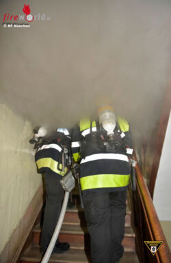 Zwei Trupps, geschützt mit Atemschutz nahmen zwei C- Rohre vor. Die Brandbekämpfung wurde über den Treppenraum und über die Drehleiter durchgeführt. Bereits nach kurzer Zeit konnte der Einsatzleiter, „Feuer unter Kontrolle“ an die Leitstelle melden. Die Wohnungen und der Treppenraum wurden auf weitere Personen kontrolliert, glücklicherweise wurde niemand mehr gefunden.