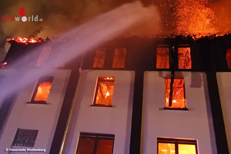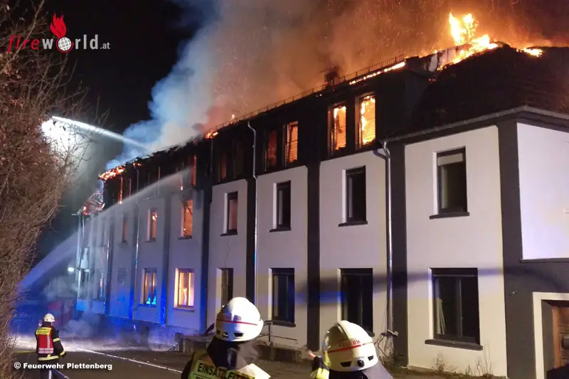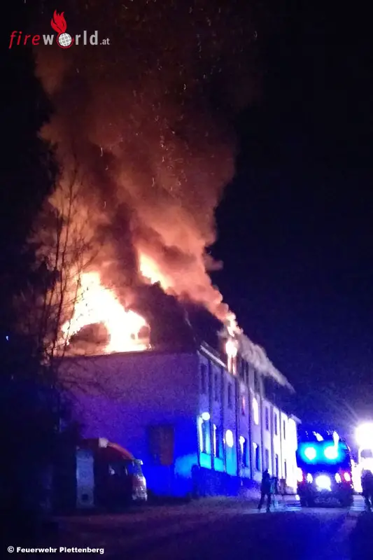 Bei Eintreffen der hauptberuflichen Kräfte brannte der komplette Dachstuhl eines älteren mehrgeschossigen Industriegebäudes, welches sich zurzeit im Umbau befindet, in voller Ausdehnung. Auch in den unterhalb des Dachgeschosses befindlichen Geschossen war bereits Feuerschein erkennbar. Auf Grund der vor Ort vorgefundenen Lage wurde die Gesamtfeuerwehr Plettenberg mit allen drei Löschzügen (LZ2 Holthausen/Oestertal und LZ3 Eiringhausen/Ohle/Selscheid), sowie eine weitere Drehleiter der Hauptwache aus Lüdenscheid nachalarmiert.