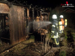 Ein im Schuppen untergestelltes Motorrad konnte der Eigentümer in letzter Sekunde vor den Flammen retten. Bereits auf der Anfahrt war der Feuerschein und Funkenflug weithin sichtbar. Nach dem Eintreffen gingen sofort zwei Trupps unter Atemschutz und mit C-Rohren gegen die Flammen vor. Das Feuer konnte schnell unter Kontrolle gebracht werden. Durch das viele Holz, welches im Schuppen gelagert war, gestalteten sich die Nachlöscharbeiten aufwendig.